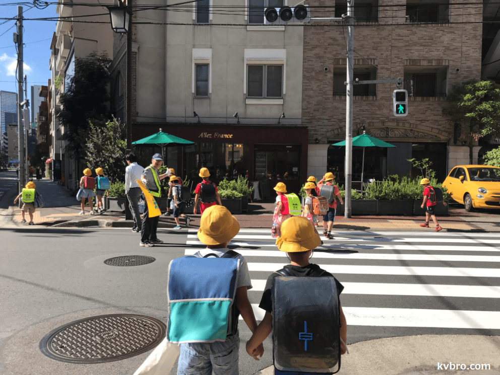 Các bé sẽ được phân chia theo nhóm đi bộ cùng nhau theo khu vực sinh sống. Mỗi khu vực sẽ được đánh dấu bằng một màu nhất định, và phát cho mỗi bé một ruy băng cùng màu đính vào mũ. Thông thường nếu bé mới vào lớp 1 thì sẽ có một nhóm các anh chị lớp lớn, thường là lớp 5 được phân công đợi tại một địa điểm nhất định để cùng đi vào một giờ nhất định. Nếu sớm hoặc muộn hơn, thì bé phải tự đi đến trường một mình. Từ lớp 2 trở đi, các bé đã quen và tự lập; thông thường khi ra khỏi nhà đúng giờ xung quanh sẽ có rất nhiều bạn bè cùng đi học, các bé tự kết nối và đi với nhau. Với các bạn trai thì còn có việc cùng chạy đua đến trường nữa.